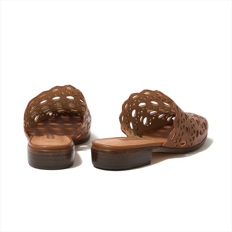 一枚の革にレースの様な模様を穴飾りで表現した、非常に手の込んだミュールサンダルをご紹介。トップラインが深く設定されているので、ミュールはパカパカして苦手、という方にも歩いた際に脱げにくい様にしています。素足が透けるので抜け感があり、ワイドパンツとの相性が◎リラックスしたスタイリングに加えるだけで大人の上質コーデが完成する、そんなミュールです。