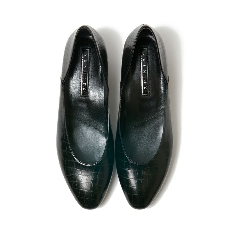 子供っぽくなりがちなラウンドトゥも、ヨシトの手に掛かれば洗練された大人フォルムに。3㎝ヒールの程よいヒール感も◎サイドがセパレート風のカッティングになっている事で、ゆったりした履き心地を実現。また、非常にソフトなイタリアンカーフレザーを使用している為、足にしっかりとフィットします。オケージョン対応のパンプスをお探しの方にもおススメです。似たデザインでY5804というプレーンパンプスがございますが、同じ木型でも履き心地がやや違いますので、履き比べて頂くとご自身にあった1足を見つけられるかと思います。今季は新色としてクロコのエナメルを採用。型押しのエナメルは硬くなりがちですが、このイタリアンレザーは足にフィットする極上の履き心地です。