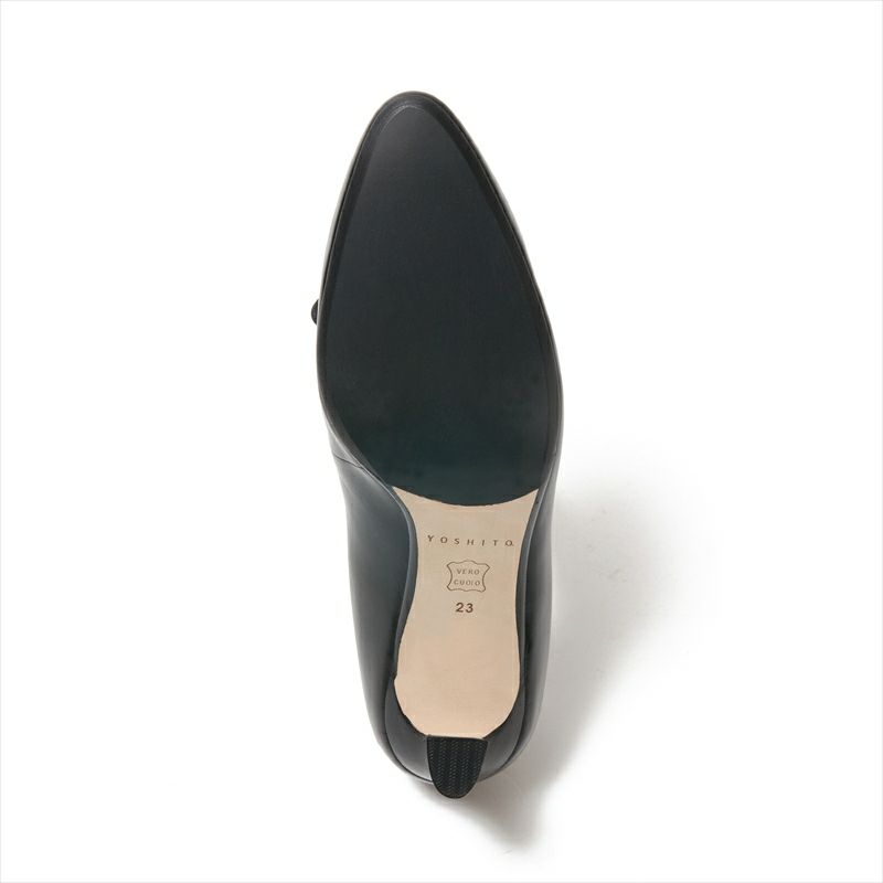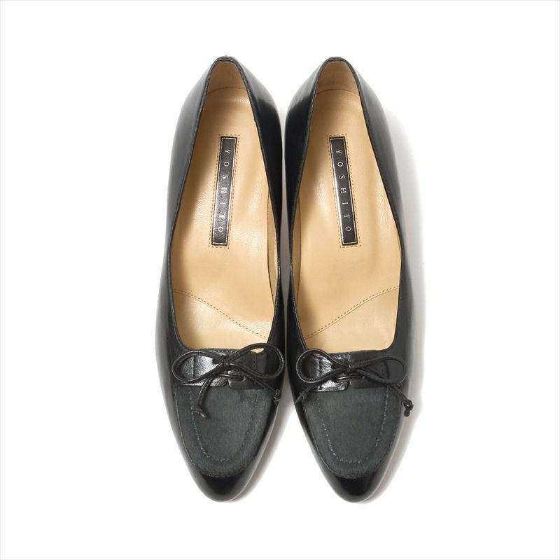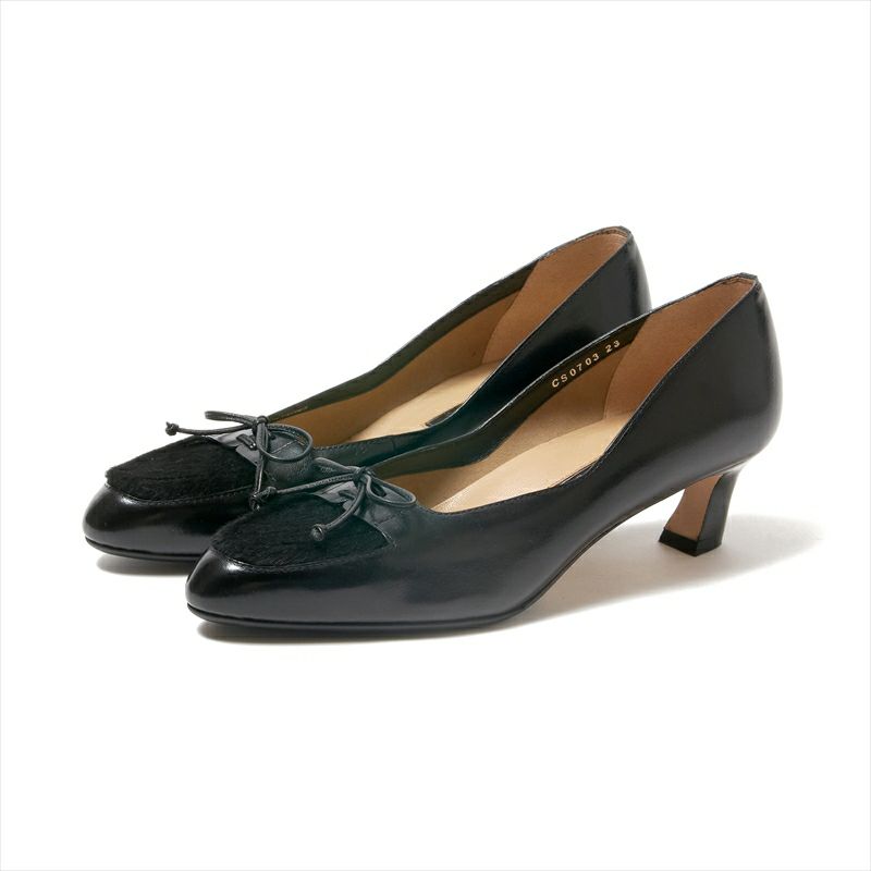 大人っぽいミドルヒールのラウンドトゥ木型でお作りした細いリボン使いのパンプスは、トラディショナルなモカシン要素とパンプスのエレガンスを兼ね備えたデザインが素敵。モカ部分はヘアカーフにする事でカジュアルダウンしつつも上品に仕上げ、大人の遊び心を感じられる1足です。甲部分が紐で少し調整が可能ですが、お作りはやや大きめです。