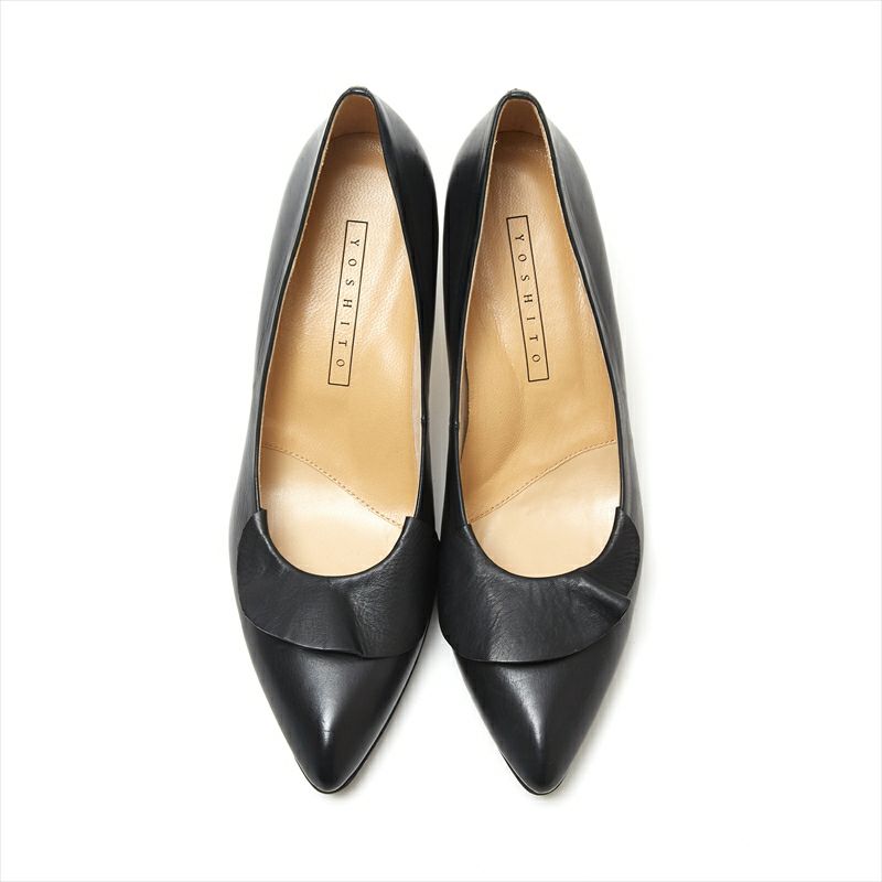 ラッフル使いをトップラインに施したフェミニンなデザインパンプスです。とても女性らしいデザインですが、甘くなり過ぎないバランスで大人の女性にもおススメ出来る様に考慮しました。ラッフルとは波立つ、という意味。優雅な花をも思わせるデザインは履いた時の美しさも必見です。本底は今回から採用した前方ゴム・踏まずから後ろが革になっている新しい形状を採用。革底よりも返りが良く、革底の様な気品があります。今季はサテンの様な上品な輝きのネイビーメタリックレザーと、レースを革に貼り合わせたフェミニンな2色をご用意。今までとはまた一味違う魅力が味わえます。