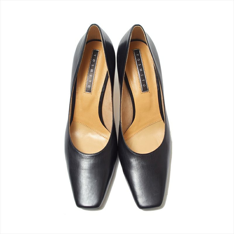 新しい7㎝ヒールのスクエアトゥ木型です。プレーンパンプスですが、計算された長めのトゥラインとサイドを浅めのカットラインにする事で足がスラっとキレイに見えます。太いフレアヒールにシャープなスクエアトゥがトレンド感がありながらモードなエレガンスとして表現されています。BRM以外はヨシトで定評のあるソフトなイタリアンカーフを使用しており、素上げの透明感が美しい上質な1足。ヒールは甲革と共巻きになっており、ヒールにかけて一体感のある仕上がりになっております。