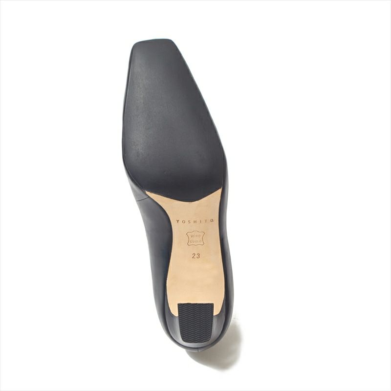 新しい7㎝ヒールのスクエアトゥ木型です。プレーンパンプスですが、計算された長めのトゥラインとサイドを浅めのカットラインにする事で足がスラっとキレイに見えます。太いフレアヒールにシャープなスクエアトゥがトレンド感がありながらモードなエレガンスとして表現されています。BRM以外はヨシトで定評のあるソフトなイタリアンカーフを使用しており、素上げの透明感が美しい上質な1足。ヒールは甲革と共巻きになっており、ヒールにかけて一体感のある仕上がりになっております。