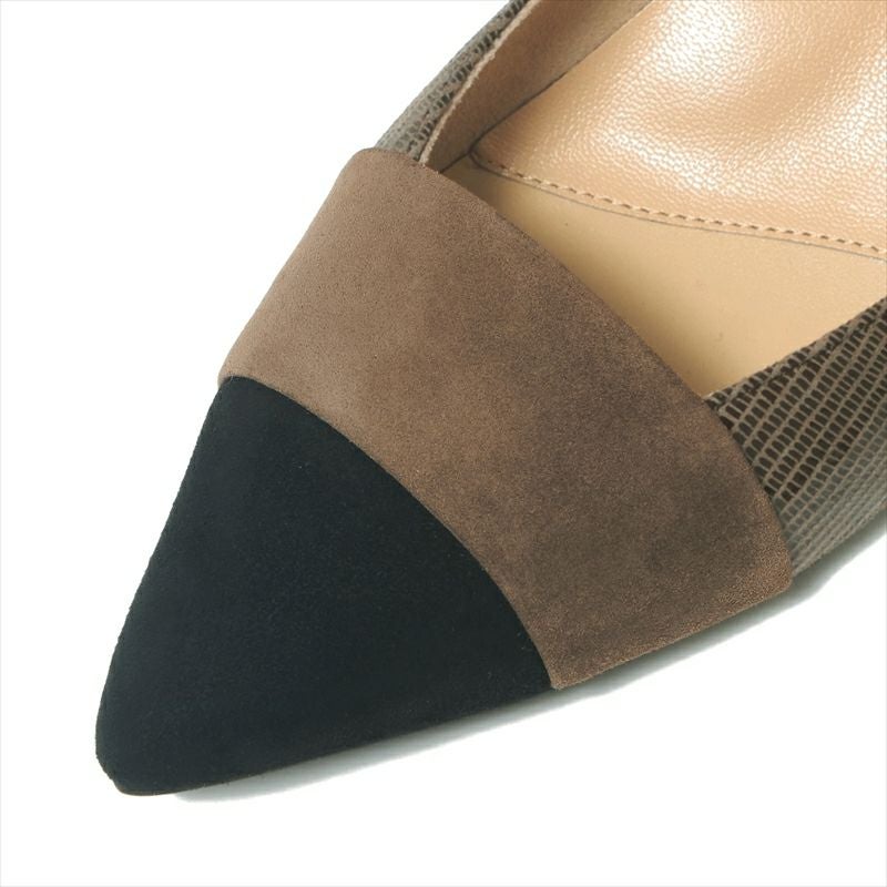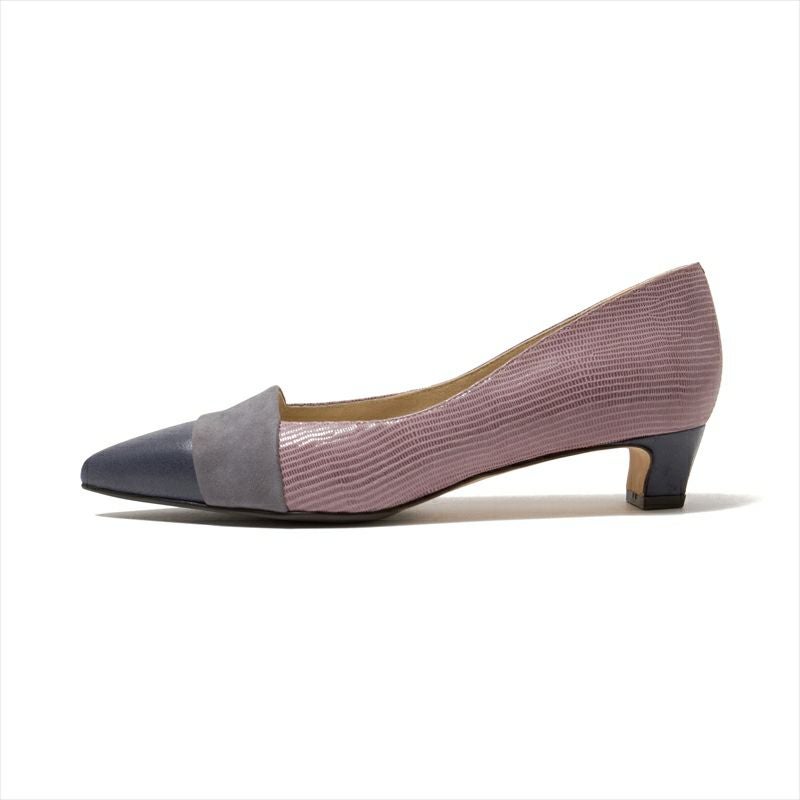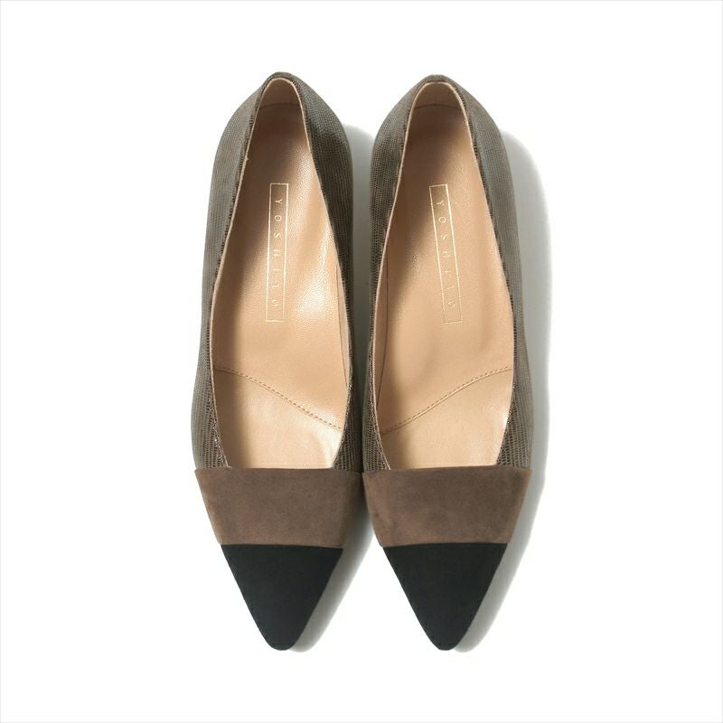 人気のカラーブロックになったコンビネーションが惹かれるデザインから3㎝ヒールが登場。トゥ先はイタリアンシルキー、踵にかけてはヨシトで人気のあるリザード柄フィルム加工レザーを使用し、ヒールはトゥ先と同じシルキー素材で巻いています。使いやすいカラーリングのBL/CとOAK/Cの他に、今季は淡いカラーが美しい新色が登場。PINK/Cのつま先部分に使用したレザーはシルキーにフィルム加工をされた素材なので、クリームを使うのはNGです。印象的な足元に仕上がる非常に美しいパンプス。