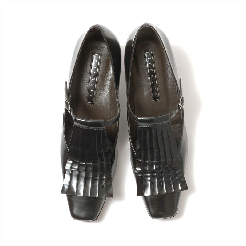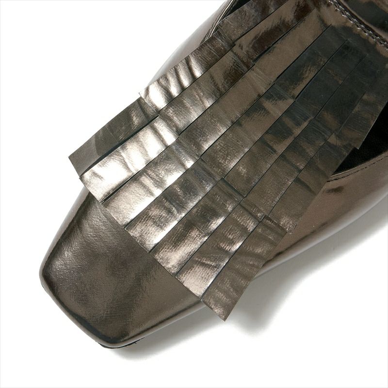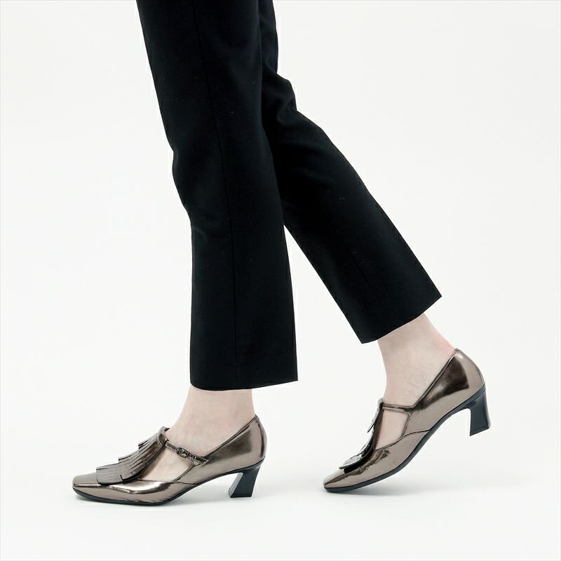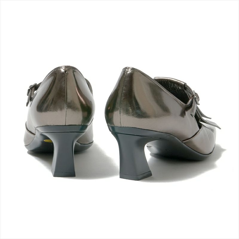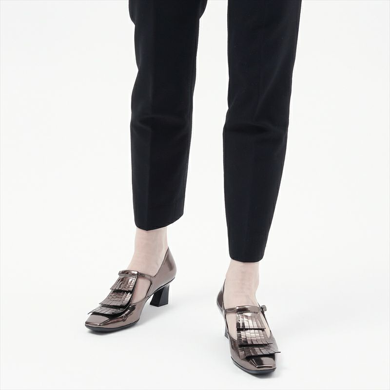 3段のフリンジディティールが遊び心いっぱいのミドルヒールパンプスをご紹介。通年お使い頂けるデザインですが、ストラップパンプスの様なイメージとフリンジ部分が甲を覆う事によってブーティの様な甲深パンプスのイメージにもなります。ストラップ部分にはゴムが入っている為、そのまま脱ぎ履きが可能。アウターのボリュームにも負けない存在感で足元に華を添える1足です。ストッキングはもちろん、タイツとの合わせも◎