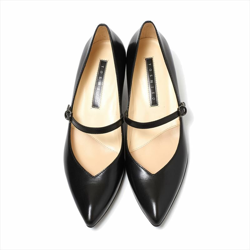 ヨシトで長く愛されるワンストラップパンプス。履き口のVカットを少し浅めに設定することで、幼くなりがちなメリージェーンも上品な大人の足元に仕上げます。前滑りしやすい方は甲にストラップが一本あるだけでパンプスがグッと履きやすくなるのでぜひ一度お試し頂きたい1足。また、ストラップを外さずにスッと履けるのも嬉しいポイント。一度自分の長さで調整しておけば毎朝安心です。長めのトゥ先が少し膨らんでいるのは爪先が当たらない様に設計されているから。指が長めの方や爪が上向きの人にも安心の木型です。本底はモールドソールを採用し、足裏全体を支える様な履き心地を得られます。4.5㎝のミドルヒールはお仕事でヒールを履かれる方に長く愛されているヨシト定番のパンプスです。