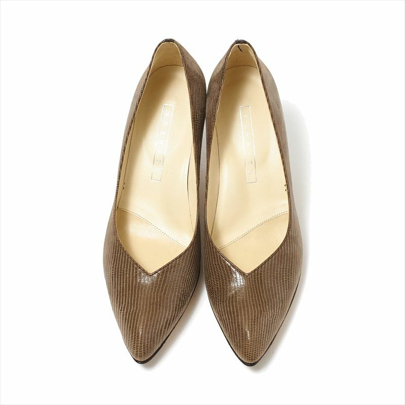 YOSHITOを代表する大定番のVカットプレーンパンプス。足を美しく見せるエレガントなラインと6.5㎝ヒールの高さを感じさせない履き心地が人気の秘密。長めのポインテッドトゥの先が少し膨らんでいるのは爪先が当たらない様に設計されているから。指が長めの方や爪が上向きの人にも安心の木型。また、革底を採用する事で上品な佇まいが生まれます。ヨシト定番のスムースキッドレザー・リザード柄フィルム加工レザーはどちらも柔らかな足当たり。履きやすいヒールパンプスをお探しの方はぜひ一度お試しくださいませ。