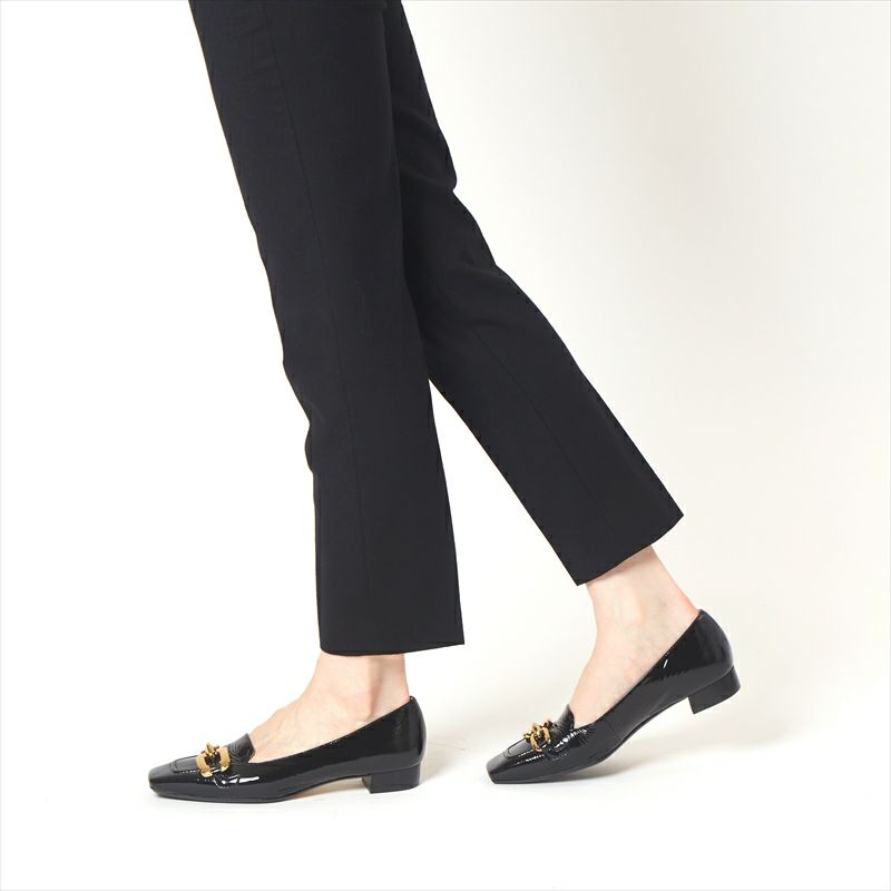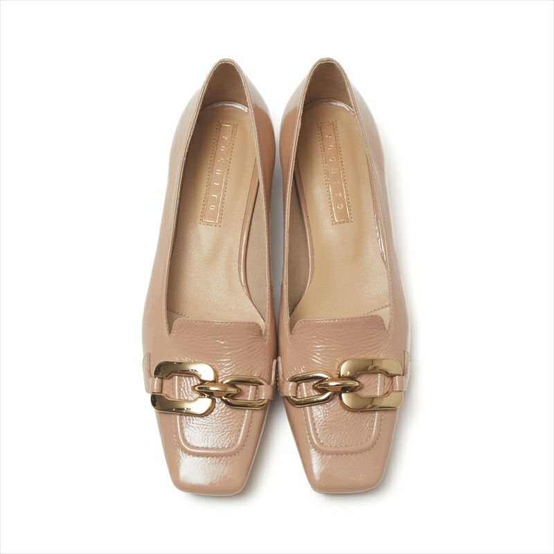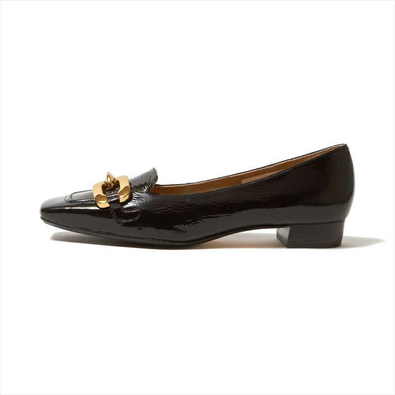 存在感のあるアシンメトリーな金具モチーフが目を引くモカデザインパンプスをご紹介。飾りモカには芯を入れる事によって立体感をプラスしました。アッパーは一枚革で包み込む様に切替えを入れない事で足入れの良い1足に。ローヒールでありながらコンサバティブな印象なので、様々なシーンでお使い頂けると思います。素材は柔らかなシワエナメルでご用意。