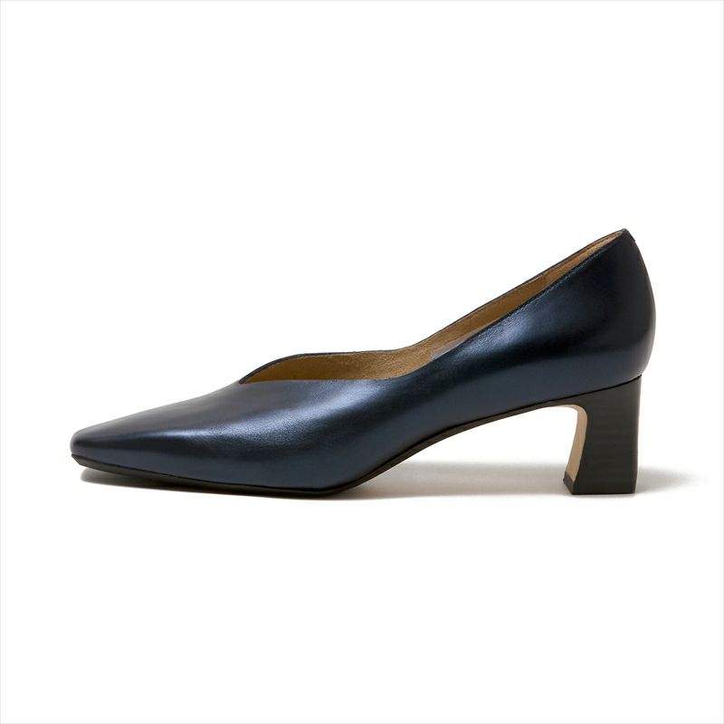 革を貼り合わた切りっぱなしのトップラインが洗練された印象の深めカットプレーンパンプスです。革は非常にソフトなイタリアンカーフレザーを使用し、足に吸い付くような履き心地。本底は今回から採用した前方ゴム・踏まずから後ろが革になっている新しい形状を採用。革底よりも返りが良く、革底の様な気品があります。今季はベーシックカラーと共に昨年人気だったサテンの様な上品な輝きのメタリックレザーからネイビーが新登場です。