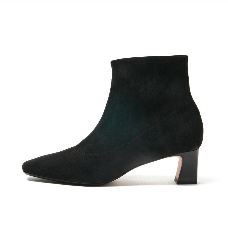 アンクル丈のストレッチブーツは限界までそぎ落とされたシンプルなデザインが魅力。大人っぽいスクエアトゥのミドルヒールが装いを選ばない万能ブーツです。もっちりしたイタリアンストレッチラムレザーの質感が価値観のある仕上がり。また、ストレッチブーツの良い点は足首に負担のないその柔らかさ。本革のストレッチブーツの良さをぜひお試しくださいませ。