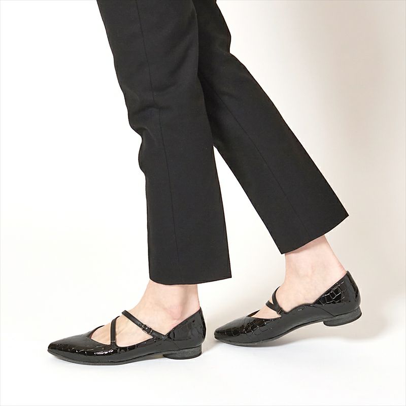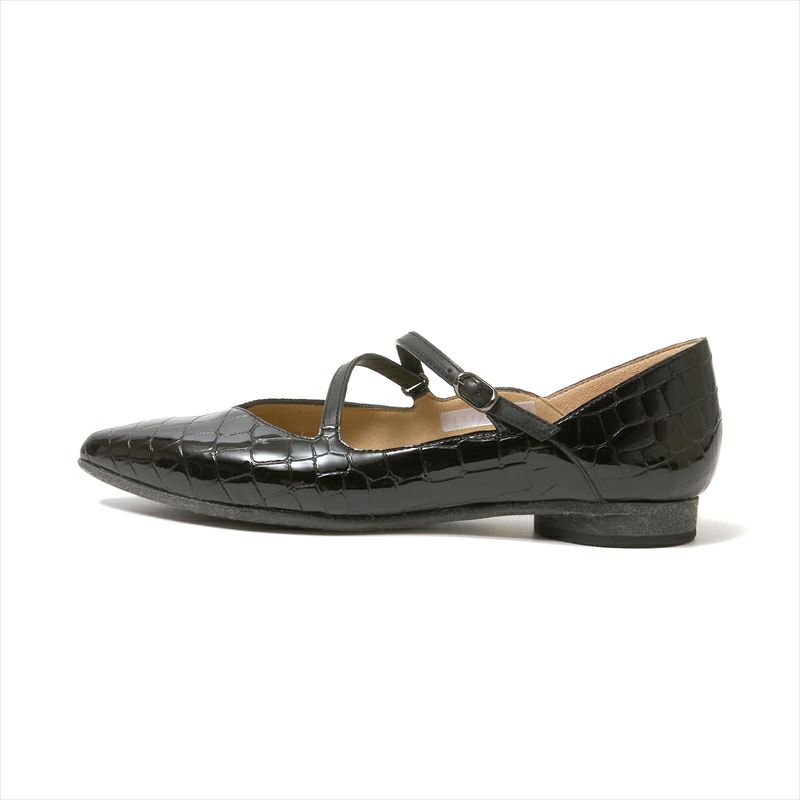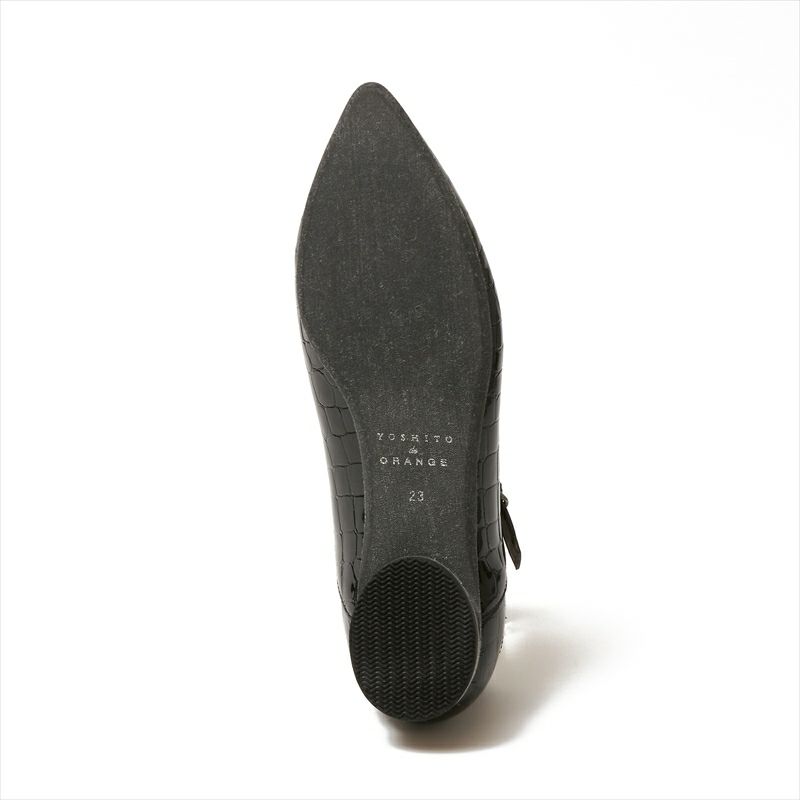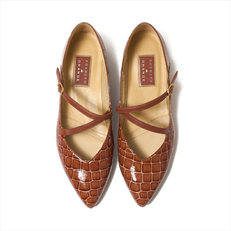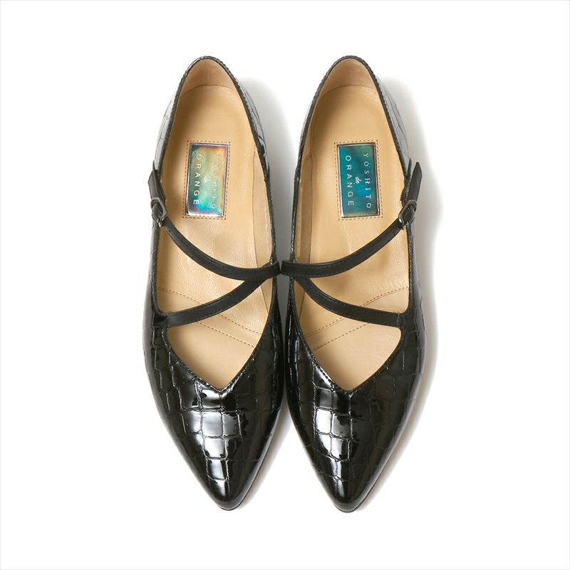 ヨシトで人気の斜めストラップパンプスからフラットタイプをご紹介。今季はツヤ感が美しいクロコ型押しにエナメルを施したイタリアンレザーが登場。革の柔らかさを活かしたリラックスした履き心地に甲をしっかり留めるストラップが歩きやすさ抜群!踵もソフトな作りなのでまるで履いていないような履き心地です。ストラップには隠しゴムが入っているのでそのまま着脱も可能。ぜひ一度お試し頂きたい1足です。
