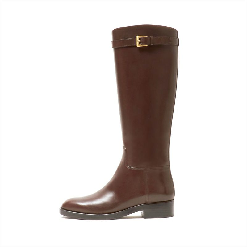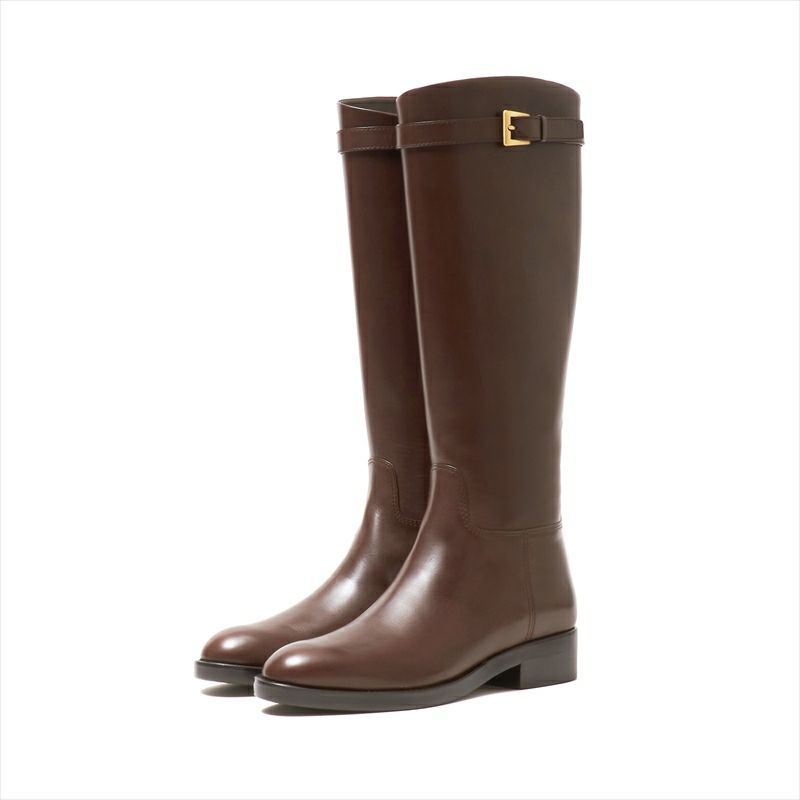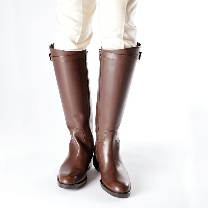 ベルテッドタイプがクラシカルな印象のジョッキーブーツをご提案いたします。内側に上まで開くファスナーを付ける事で脱ぎ履きがしやすいのが魅力的。また、足首を絞る事で足がキレイに見えるややフィットめのセミルーズシルエットに仕上げました。革はジョッキーブーツにぴったりのイタリアンカーフレザーを使用。履くほどに味の出る上質なレザーは長く付き合えること間違いなし。本底はVIBRAM社の発泡ラバーソールを使用しているので軽やかな履き心地です。どうせロングブーツを買うなら、流行に流されないこちらのブーツをおススメ致します。