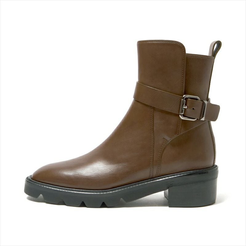 エッジの効いたスクエアトゥとボリュームソールのバランスが程よいベルテッドブーツのご紹介です。軽いEVAソールにヒールを合わせ、軽さとボリュームの良い所を兼ね備えました。メンズライクなデザインを足首を絞った女性らしいシルエットに落とし込む事で履いた人の女性らしさを引き立てるショートブーツに仕上がりました。透明感のあるイタリアンカーフレザーは履くほどに味の出るレザーです。今季は新色として大人っぽいカーキカラーが登場。