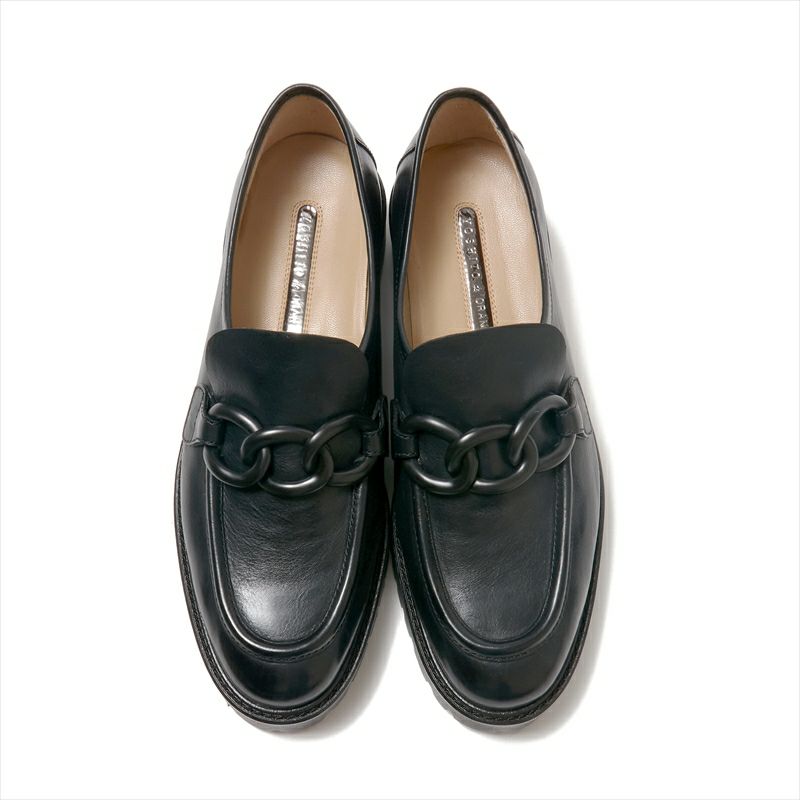 トレンドのボリュームソールをORANGEなりの解釈でご提案。本底にはVIBRAM社の軽量EVAソールを採用し、軽さとクッション性が履きやすい。ワンヒールの様な形状とサイドから見たギザギザの間隔が狭い事で、ボリュームソールにありがちなゴツさを軽減しています。ボリュームソールながらあえてシルエットを外広がりではなくストレートに落とす事で、足元が大きくなり過ぎないバランスを熟考しました。今季は人気のビッグチェーンを取り付けて華やかに。女性らしさとリッチな印象をプラスしています。それぞれレザーに合わせたチェーン使いが目を惹く1足です。