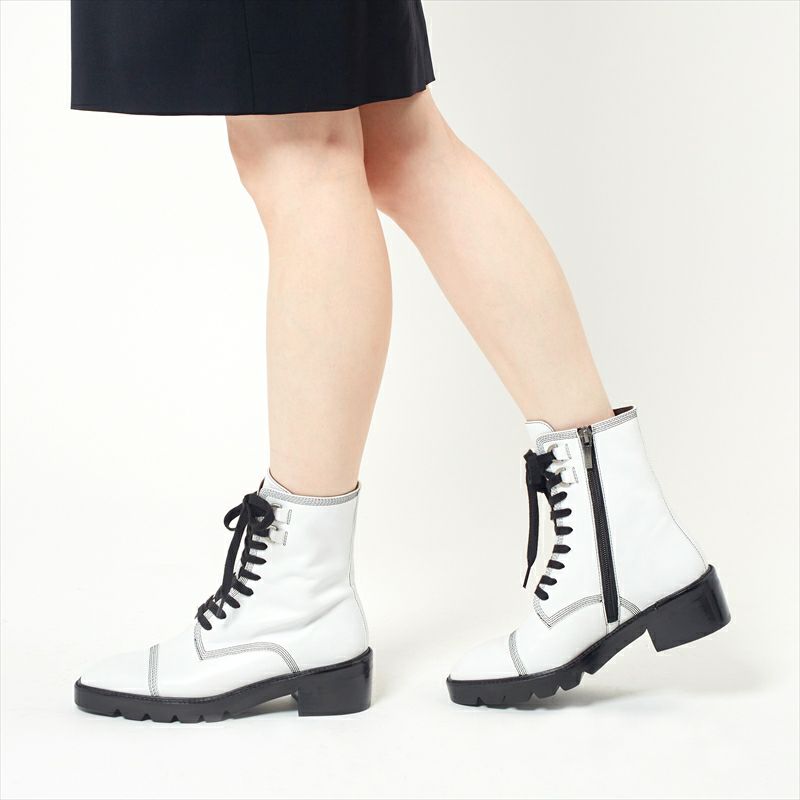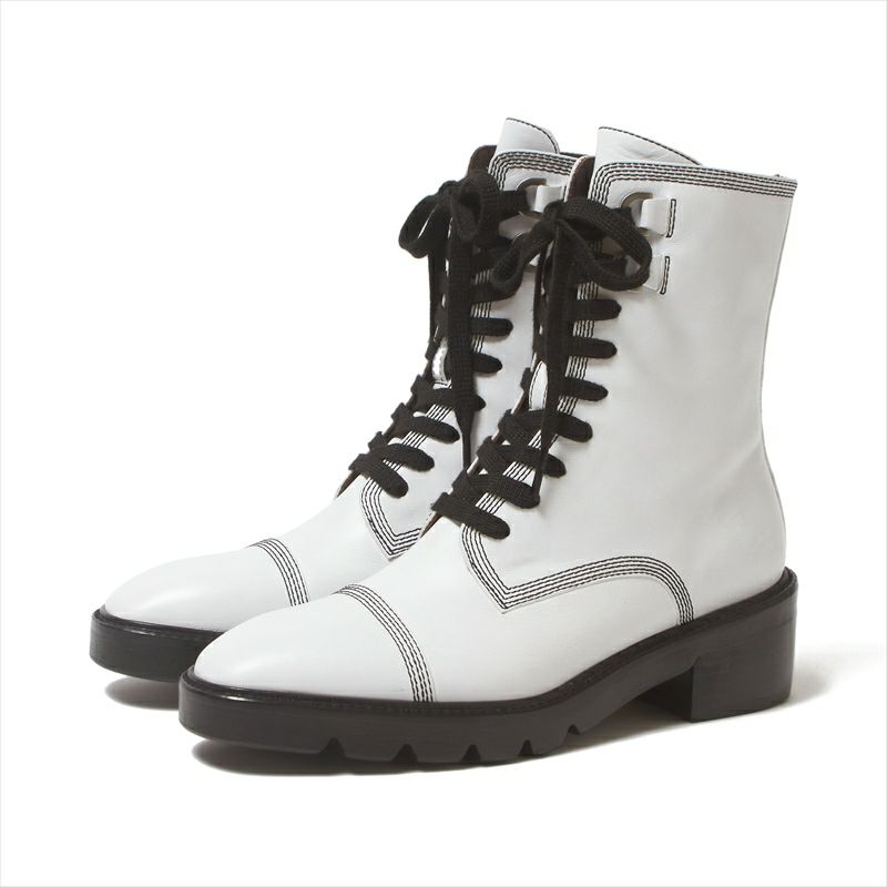 エッジの効いたスクエアトゥとボリュームソールのバランスが程よいレースアップブーツのご紹介です。シンプルなレースアップデザインにステッチのディティールを加える事で、非常に手の込んだ作りになっております。上品に絞られた足首のシルエットと太めのシューレースが女性らしい柔らかな印象に。カラーによって印象の変わるおススメの1足です。