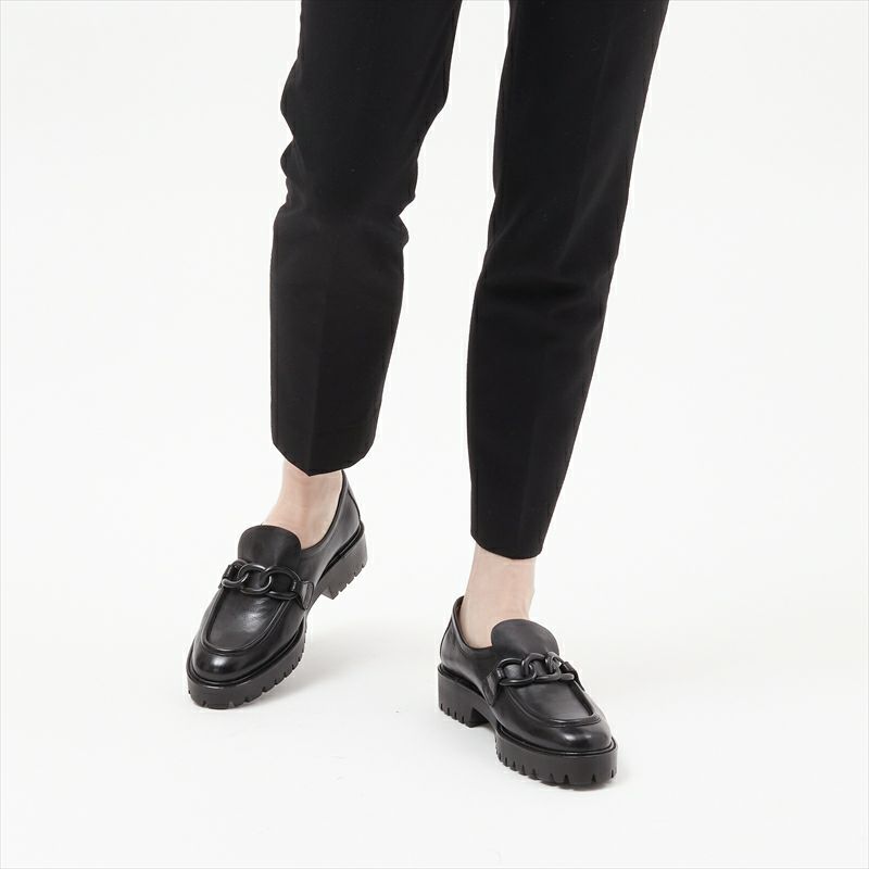 トレンドのボリュームソールをORANGEなりの解釈でご提案。本底にはVIBRAM社の軽量EVAソールを採用し、軽さとクッション性が履きやすい。ワンヒールの様な形状とサイドから見たギザギザの間隔が狭い事で、ボリュームソールにありがちなゴツさを軽減しています。ボリュームソールながらあえてシルエットを外広がりではなくストレートに落とす事で、足元が大きくなり過ぎないバランスを熟考しました。今季は人気のビッグチェーンを取り付けて華やかに。女性らしさとリッチな印象をプラスしています。それぞれレザーに合わせたチェーン使いが目を惹く1足です。