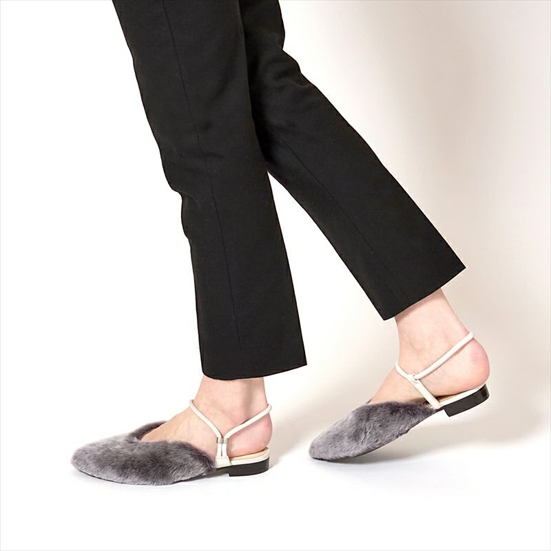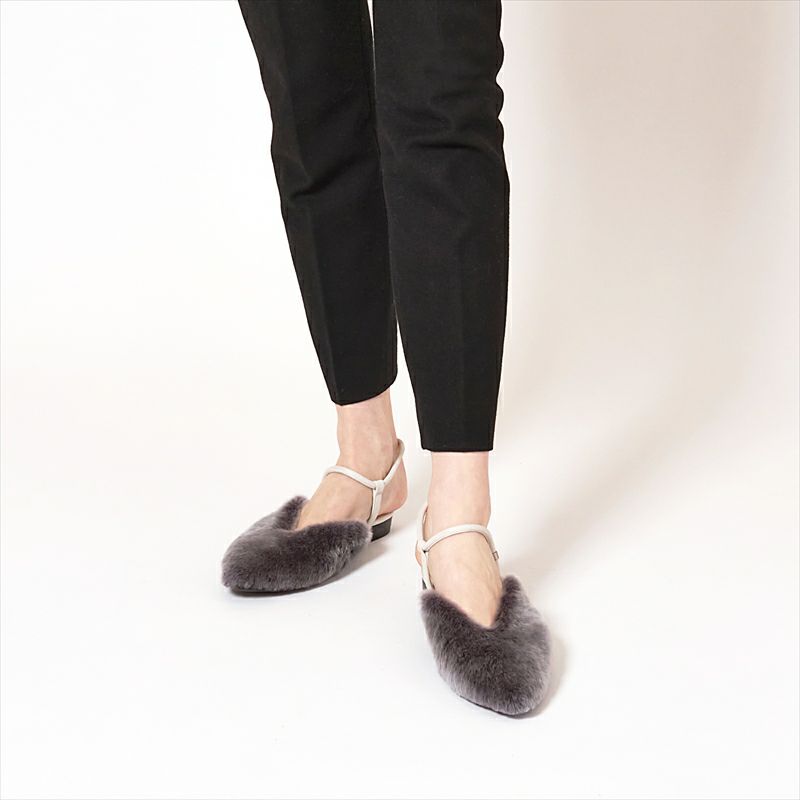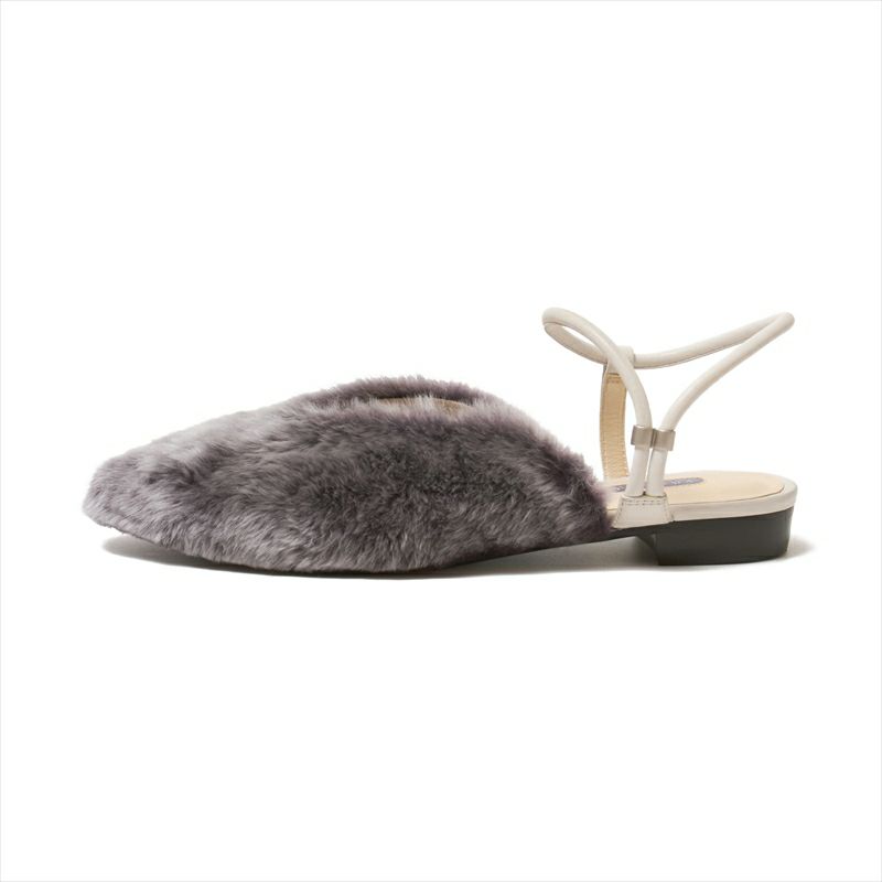 思わず撫でたくなるモコモコの本ムートンが足を優しく包み込むファーシューズが新登場!金具で足首を調節出来る人気のストラップと組み合わせる事でとっても履き心地の良い1足に。根元から毛先にかけてグラデーションになったファーは立体感と高級感があります。踵が開いているのでまだまだ暑い残暑には素足で涼しく、気温が下がったらタイツや靴下と合わせる事で長い期間履く事が可能。ワイドパンツに合わせ、ファーを覗かせるコーディネートがおススメです。