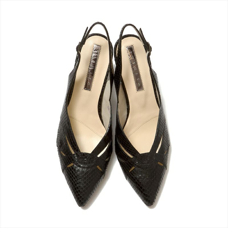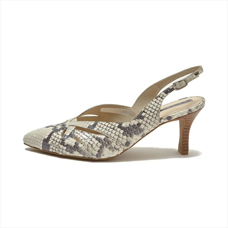 美しいシルエットと革を組んだディティールがこれからの季節にピッタリのバックストラップパンプスをご紹介。ほっそり見えますが、履くと非常にゆったりした履き心地にまずびっくりします。カラーによってコバの色をアッパーとコンビネーションにする遊び心が効かせ、履くと程良い差し色に。KHAにはオレンジ、SVには水色のコバ色になっています。パイソンの型押しはコーディネートを垢抜けた印象にしてくれ、思った以上に使いやすいのが魅力です。