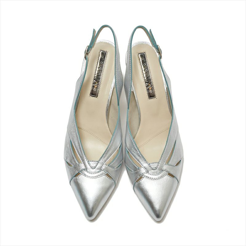 美しいシルエットと革を組んだディティールがこれからの季節にピッタリのバックストラップパンプスをご紹介。ほっそり見えますが、履くと非常にゆったりした履き心地にまずびっくりします。カラーによってコバの色をアッパーとコンビネーションにする遊び心が効かせ、履くと程良い差し色に。KHAにはオレンジ、SVには水色のコバ色になっています。パイソンの型押しはコーディネートを垢抜けた印象にしてくれ、思った以上に使いやすいのが魅力です。