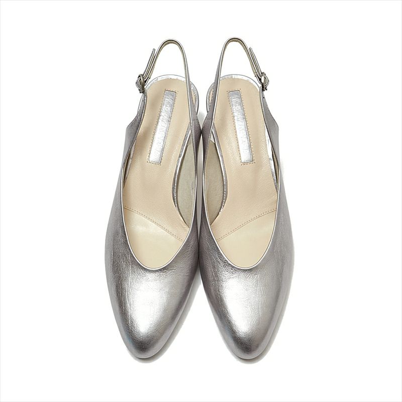 大人の為のアーモンドトゥミドルヒールが新鮮な新木型の登場です。シンプルなバックストラップパンプスは、足をキレイに見せるカットラインと履き口にステッチを見せない製法が上品な印象。横幅をしっかり押さえる様な履き心地と、トゥラインがやや長く、高さもあるので親指の爪が当たりやすい人にも履きやすい。裏材はシルキーにしているので柔らかな履き心地。スムースタイプはラグジュアリーブランドも愛用している上質なラムレザー、シルバーはカーフメタリックを使用しています。