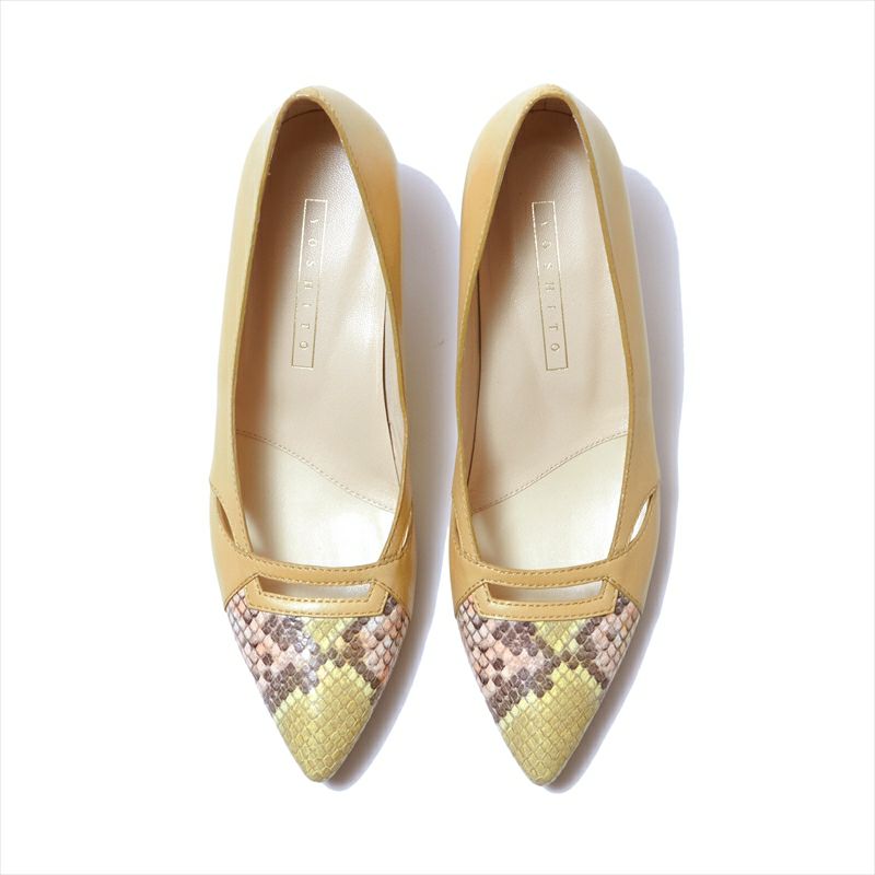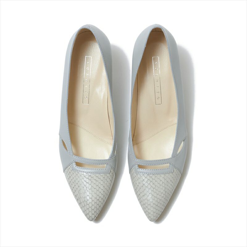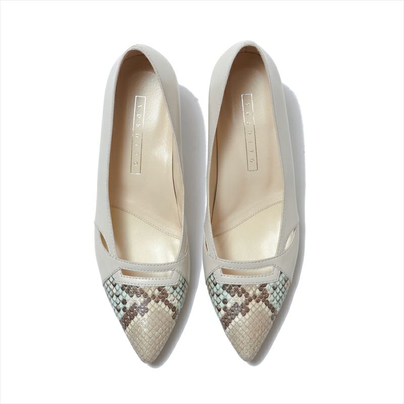 程よくデザインの入った履き心地の良いパンプスは使い勝手も◎どんなスタイリングにも合わせやすく、どこか印象に残る足元に仕上がります。長めのポインテッドトゥの先が少し膨らんでいるのは爪先が当たらない様に設計されているから。指が長めの方や爪が上向きの人にも安心の木型です。本底は返りの良いラバーソールを採用。従来のヒールよりスッキリしたシルエットに改良されたヒールは4.5㎝という程よいヒール高で人気があります。柔らかなイタリアンキッドレザーを使用する事で、履くほどに足に馴染む一足です。今季は爪先にパイソン型押しレザーを使用したコンビネーションカラーは新登場。