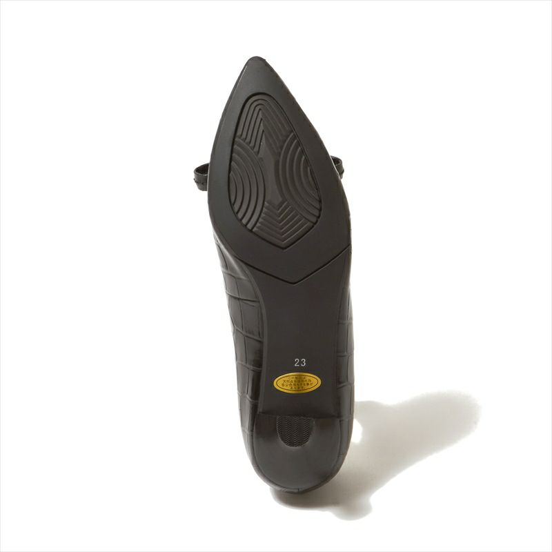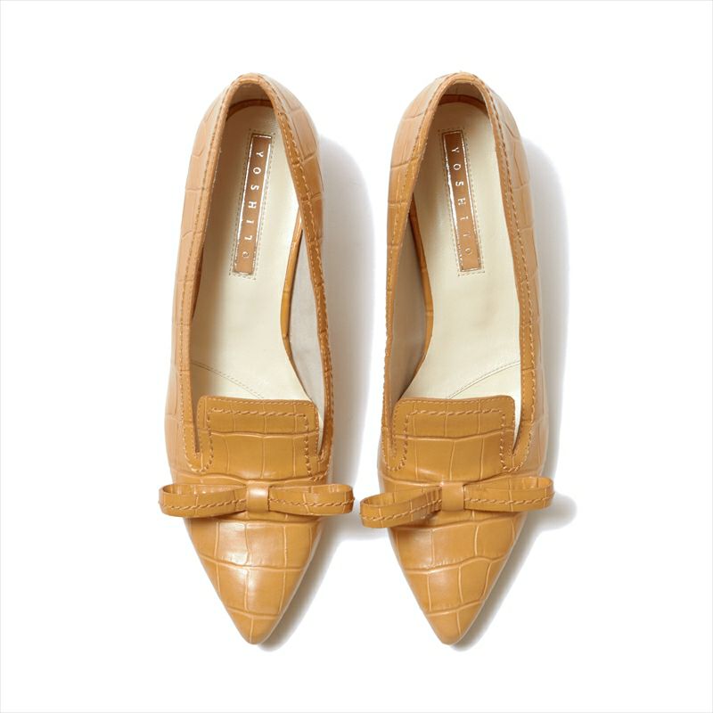 大きめのリボンがキャッチーなデザインがオシャレなパンプスは、クロコ型押しレザーを仕様する事でかわいらしさと大人っぽさが共存したパンプスに仕上がりました。デザイン性が高く、一見コーディネートが難しそうに思えますが、肌馴染みの良いカラーとクラシックな印象の型押しレザーを使用する事で意外とどんなスタイルにもマッチします。また、定評のある4.5㎝ヒール木型は足入れも抜群。デザイン性と履き心地を兼ね備えたパンプスです。