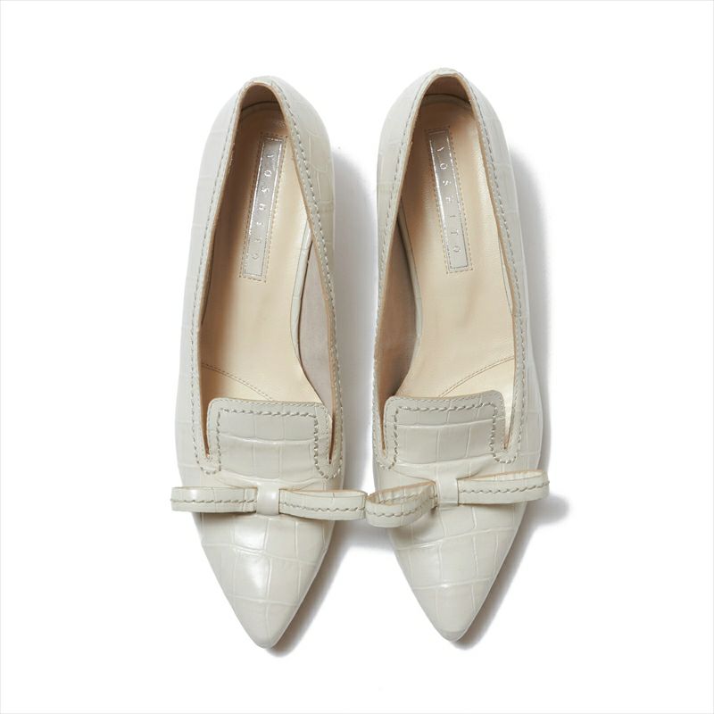 大きめのリボンがキャッチーなデザインがオシャレなパンプスは、クロコ型押しレザーを仕様する事でかわいらしさと大人っぽさが共存したパンプスに仕上がりました。デザイン性が高く、一見コーディネートが難しそうに思えますが、肌馴染みの良いカラーとクラシックな印象の型押しレザーを使用する事で意外とどんなスタイルにもマッチします。また、定評のある4.5㎝ヒール木型は足入れも抜群。デザイン性と履き心地を兼ね備えたパンプスです。