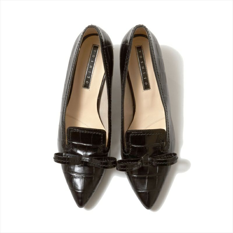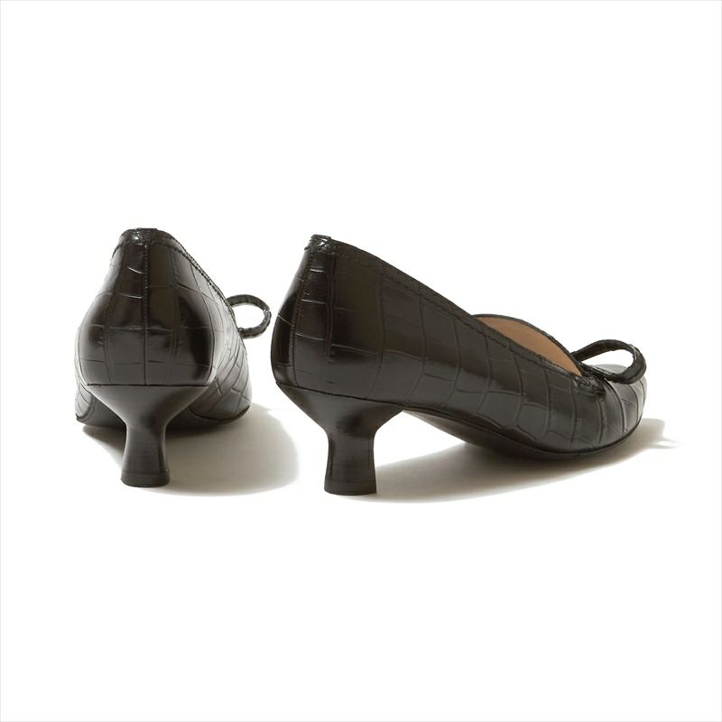 大きめのリボンがキャッチーなデザインがオシャレなパンプスは、クロコ型押しレザーを仕様する事でかわいらしさと大人っぽさが共存したパンプスに仕上がりました。デザイン性が高く、一見コーディネートが難しそうに思えますが、肌馴染みの良いカラーとクラシックな印象の型押しレザーを使用する事で意外とどんなスタイルにもマッチします。また、定評のある4.5㎝ヒール木型は足入れも抜群。デザイン性と履き心地を兼ね備えたパンプスです。