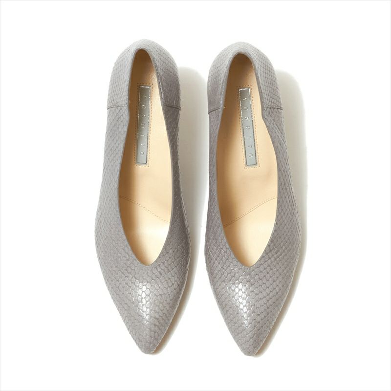 足を包み込む深いカットと、裏革にシルキー素材を採用した素足で履いても気持ちが良いプレーンパンプスは履き心地をデザインした1足。上質なイタリアンソフトカーフレザーを大胆に使用する事で素材の価値観を最大限に生かした新しい試みのリラクシングパンプスです。足に吸い付くような感触が足にピタリとフィットします。登場してから瞬く間にヒットし、履いた瞬間の柔らかな履き心地に感動する女性が続出。ただ、柔らかいからこそ足の指の形が出るのが気になるとのお声があったので、今季はパイソンの型押しレザーの新素材を採用。柄がある分、スムースレザーよりも指の形が目立ちません。長めのポインテッドトゥの先が少し膨らんでいるのは爪先が当たらない様に設計されているから。指が長めの方や爪が上向きの人にも安心の木型です。また、本底をゴム底にする事で屈曲性が良く、滑りづらいのも嬉しいポイント。