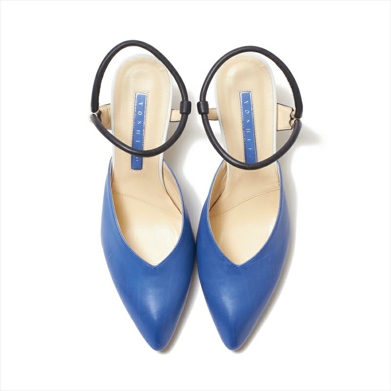 ヨシト定番のVカットパンプスを、細いアンクルストラップデザインへ昇華しました。外側についた金具を上下に動かす事で、足首にピッタリとフィットし、脱げにくく歩きやすいのが特徴です。ストッキングで履く時にも滑りにくい様に、中敷きの前方滑り止め素材の範囲を通常よりも広くする事で、より履きやすい工夫がされています。
