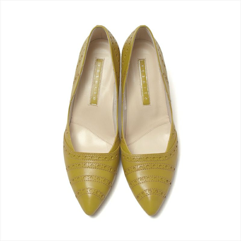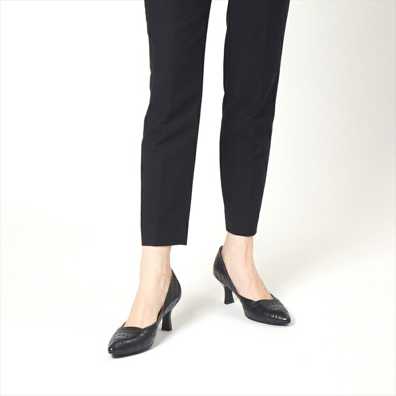 定評のある6.5㎝ヒール木型に穴飾りを全面に施す事で、美しいパターンが入った様な上品かつ印象的なパンプスに仕上がりました。前は深く、サイドは浅いカッティングで安定感がありながらも美しいシルエットに。デイリーに使える様に本底はラバーソールにしました。春らしく繊細なキッドレザーのカラー展開も◎長めのポインテッドトゥの先が少し膨らんでいるのは爪先が当たらない様に設計されているから。指が長めの方や爪が上向きの人にも安心の木型です。
