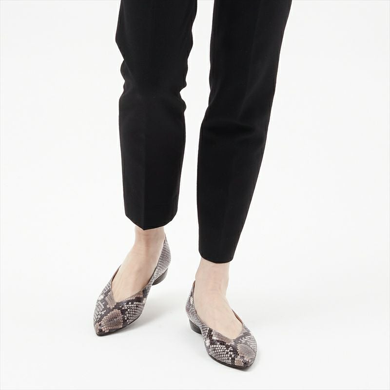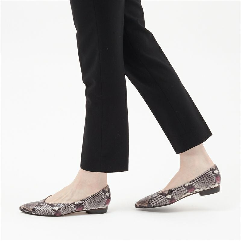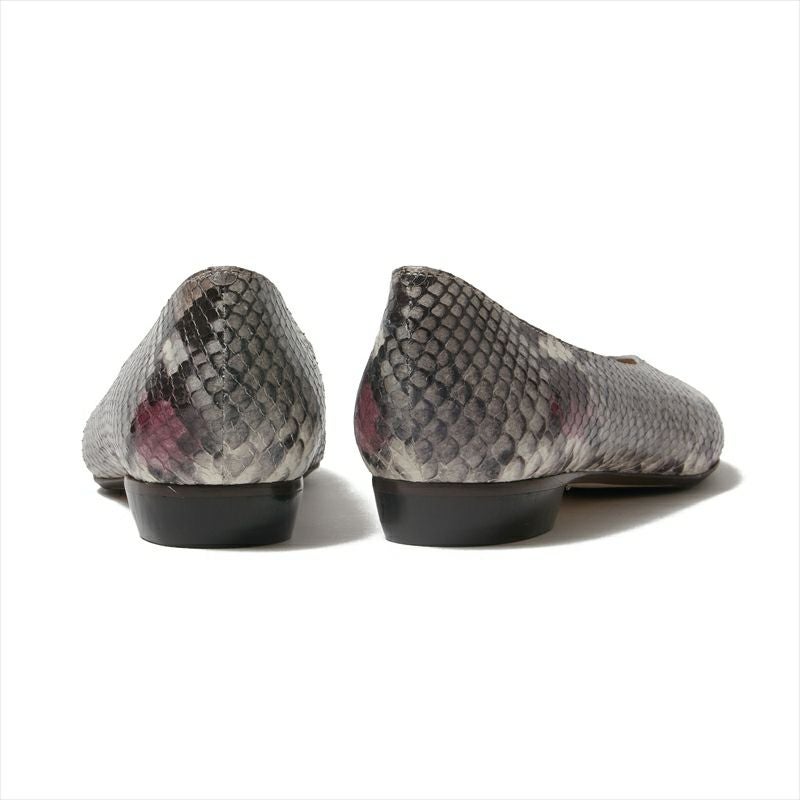 シンプルな深めVカットのフラットパンプスは素材に変化を付ける事で心弾むパンプスに仕上げました。甲部分だけ見ると使いやすいグレー系のパイソン柄ですが、サイドに見えるラズベリーカラーが1アクセントに。ネーム部分にも同色にする事で心躍る女性らしい1足に仕上げました。本底は前方ゴム・踏まずから後ろは革底になっており、エレガントな雰囲気がありながら返りの良い仕様です。