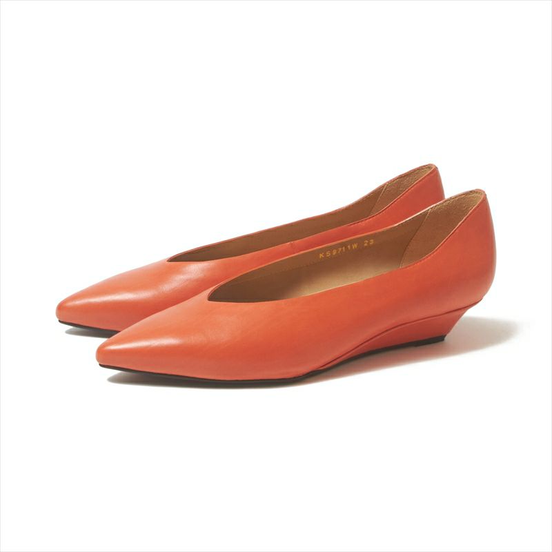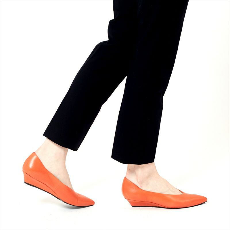 トレンドでも登場しているウエッジヒールのパンプスがヨシトから久しぶりに登場。スッキリしたシルエットで足を美しく見せながら高さを感じさせない3㎝ヒールが魅力です。こちらのやや深めのカッティングのタイプは外反母趾などのお悩みの足もすっぽりと包み込むカッティングと、履き口をステッチのない革を貼り合わせた製法にしている為、一枚革に包まれる様な履き心地。踵部分に抑揚を持たせる事で足首の外踝が当たりやすい方も安心のデザインです。革は透明感のあるイタリアンソフトカーフレザーと、メタリック加工を施した物、箔素材のシルバーをご用意。
