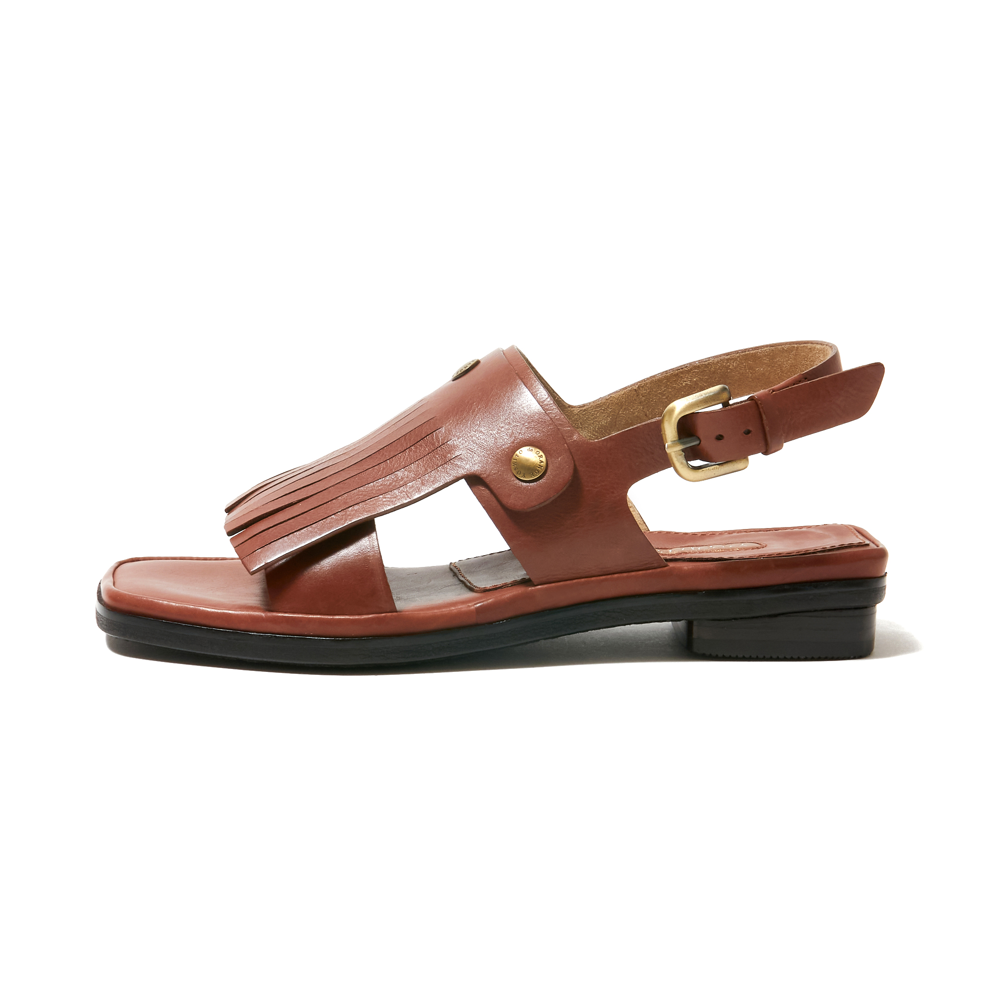 足元にはフリンジデザインが印象的なサンダルを合わせる事で、程よくエッジの効いた存在感とリッチさを演出しました。