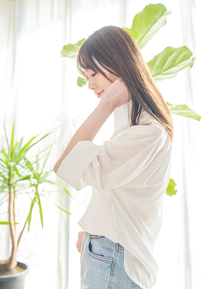 襟を立たせる事で首回りの抜け感を作り、首の細さやデコルテの美しさを引き立てます。