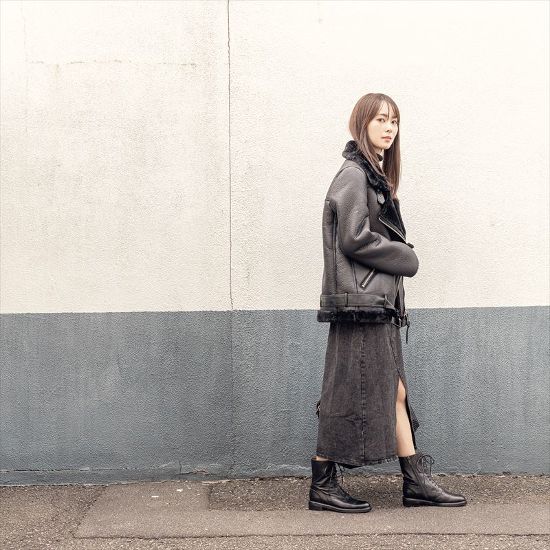 大振りなボア襟が存在感あるライダースジャケットのワイルドさには、ベーシックなレースアップブーツを合わせて、大人かっこいいスタイリングに。