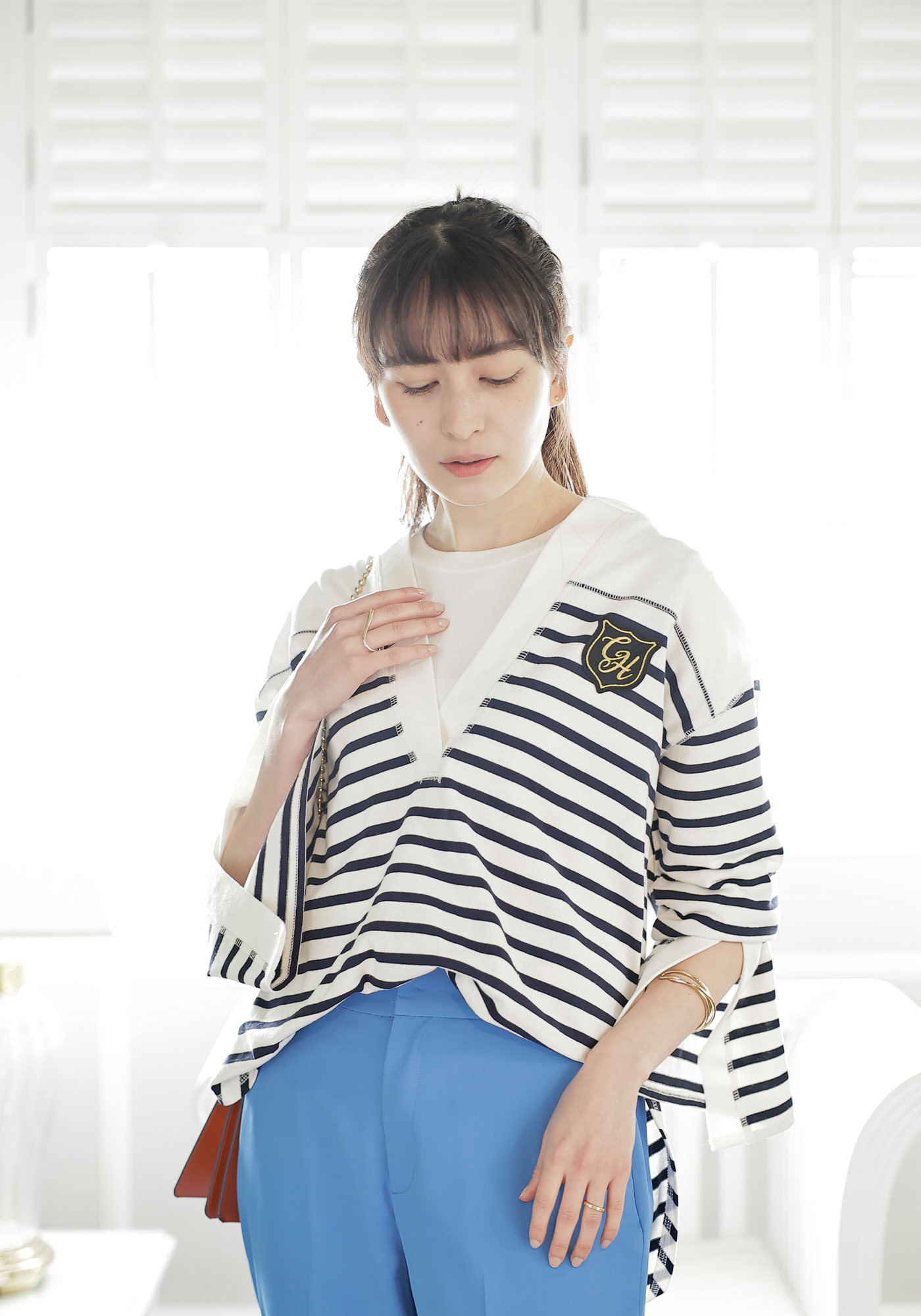 大きく開いたキーネックがポイントのボーダーカットソーで新しいマリンスタイルをご提案。