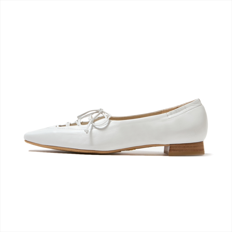 足元にはバレエシューズの様なレースアップデザインが目を引くフラットシューズを合わせ、キレイめながらもリラックスした装いに。