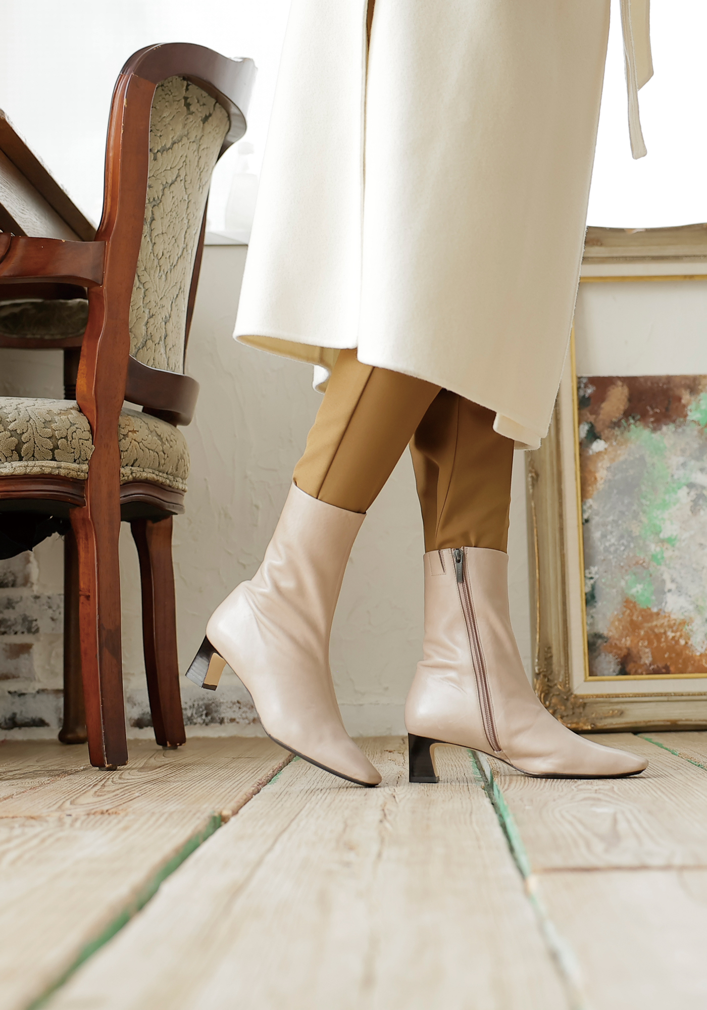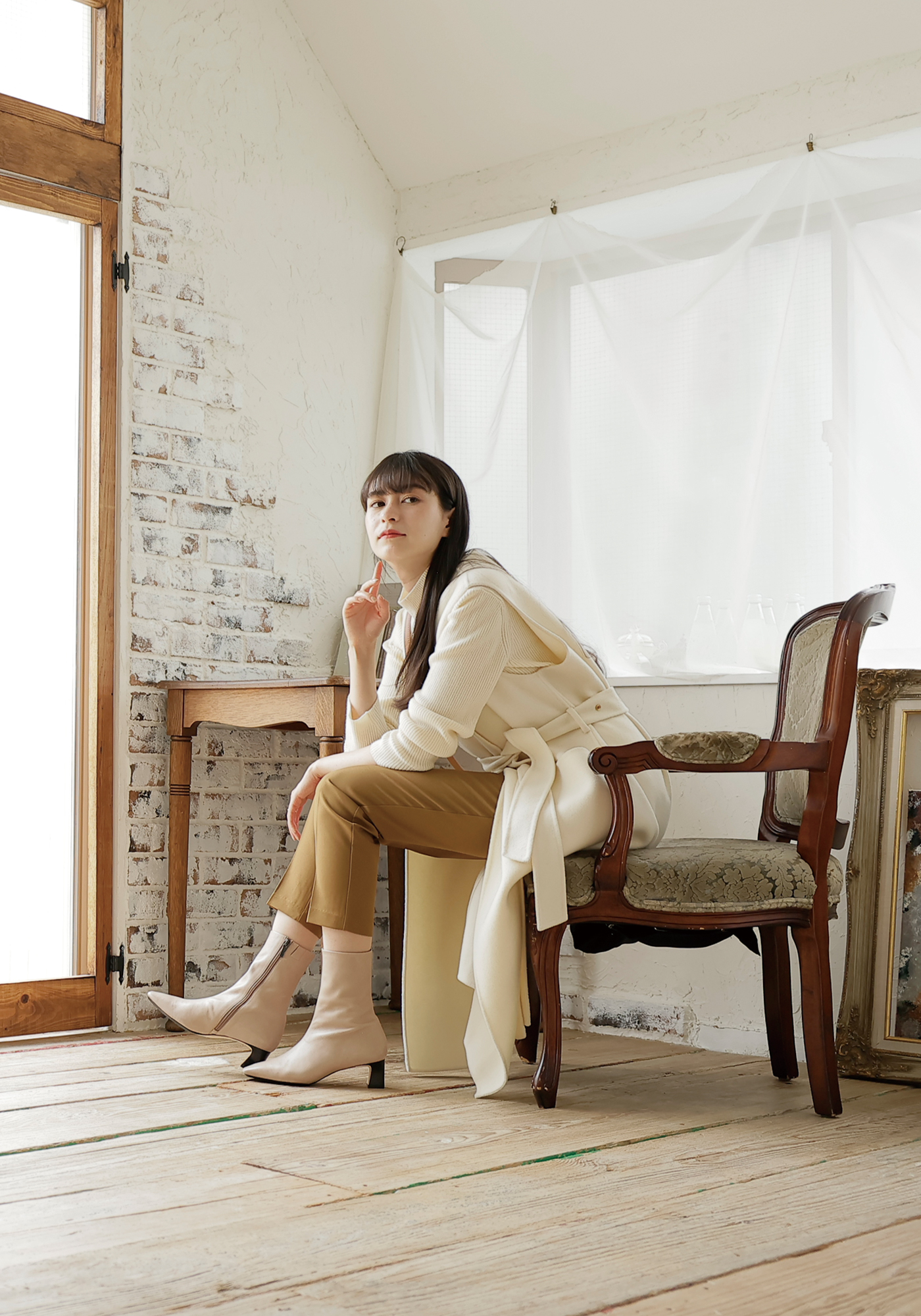 足元には淡いカラーのブーツを選び、全体のバランスを取る事で大人のエレガントな上品さを表現しています。